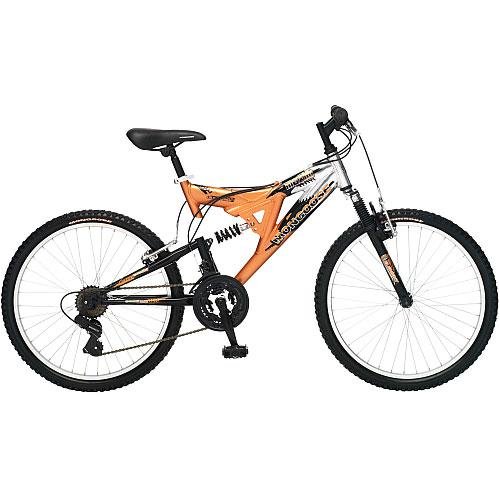Mongoose 24 Inch Boy's Maxim BikeThe Mongoose Maxim boy's mountain bike is ready to ride on and off the trail with an aluminum dual suspension frame. It's equipped with 21-speed SRAM gripshifting and front and rear linear pull brakes. The front and rear suspension work together to give you a smooth overall ride by absorbing harsh bumps.